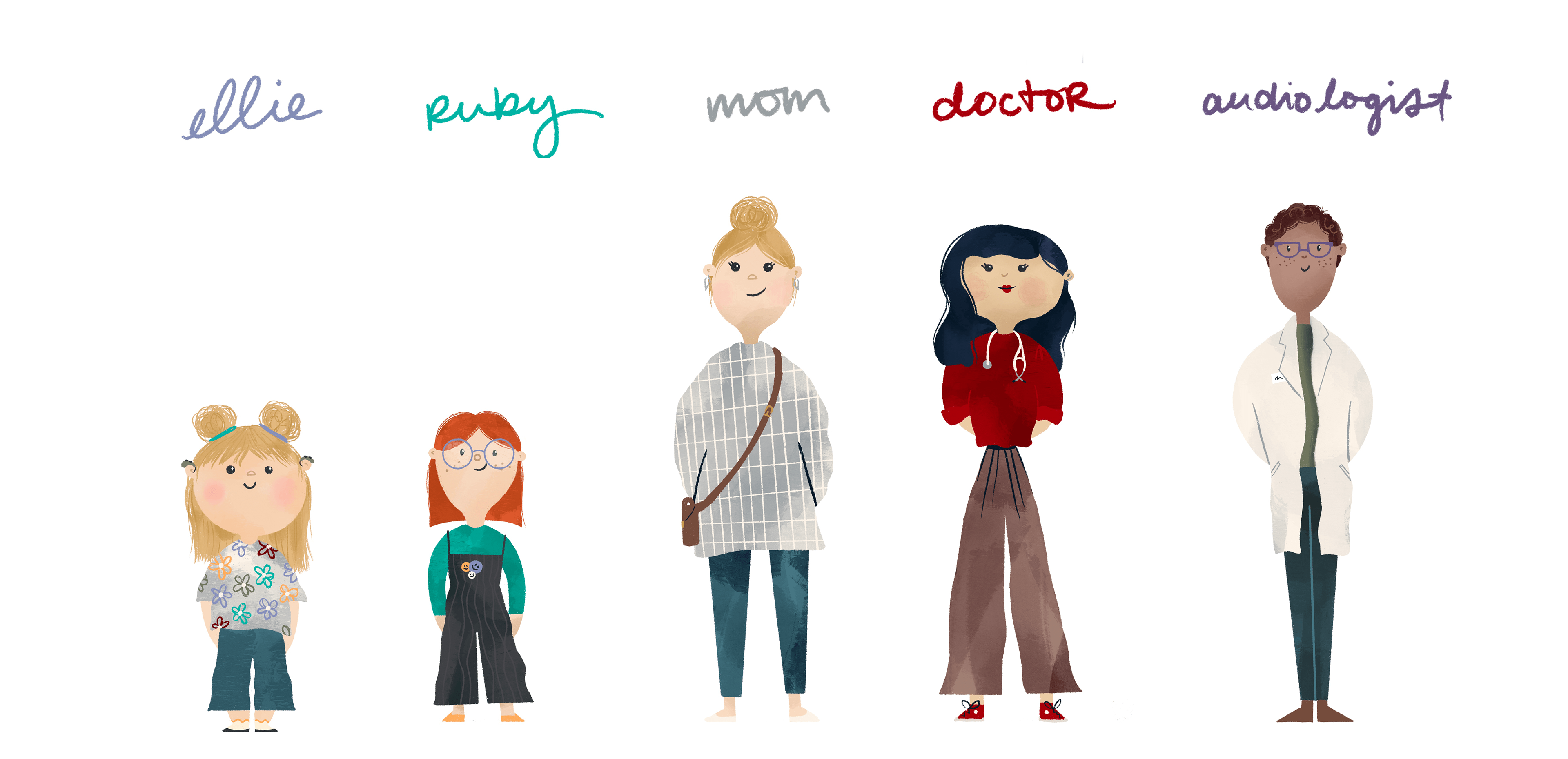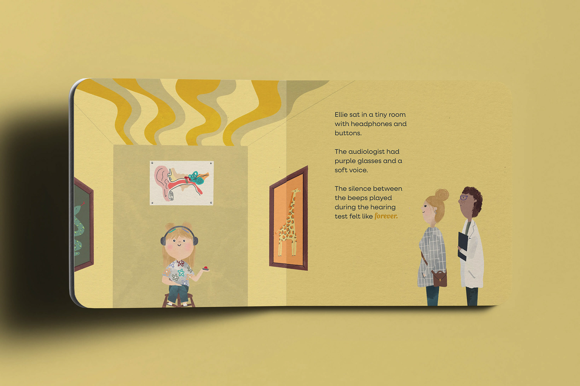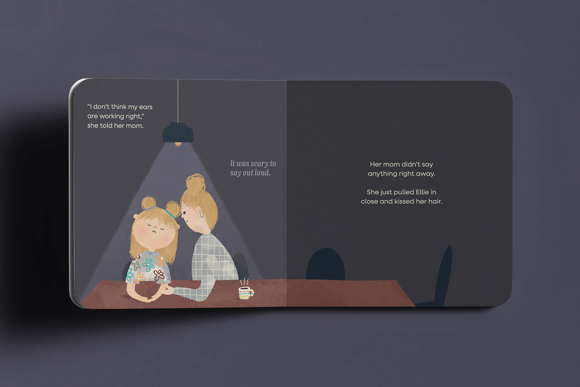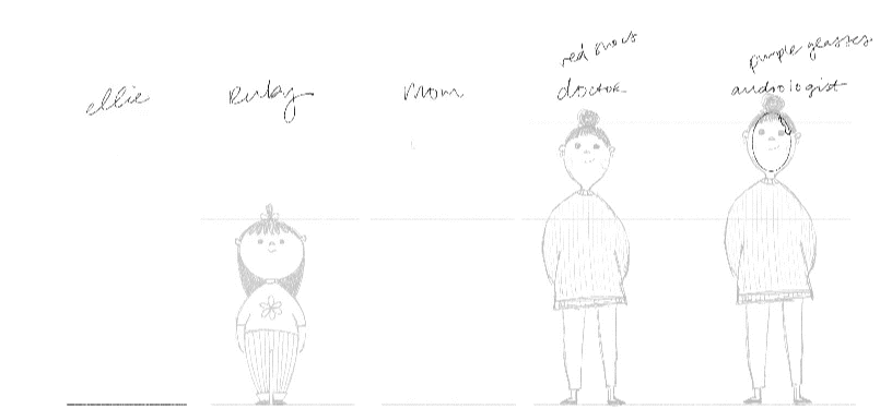 Illustrations and layout for a children's book that follows a child's journey of hearing loss and accepting their new normal. It shows how to listen with your whole heart.